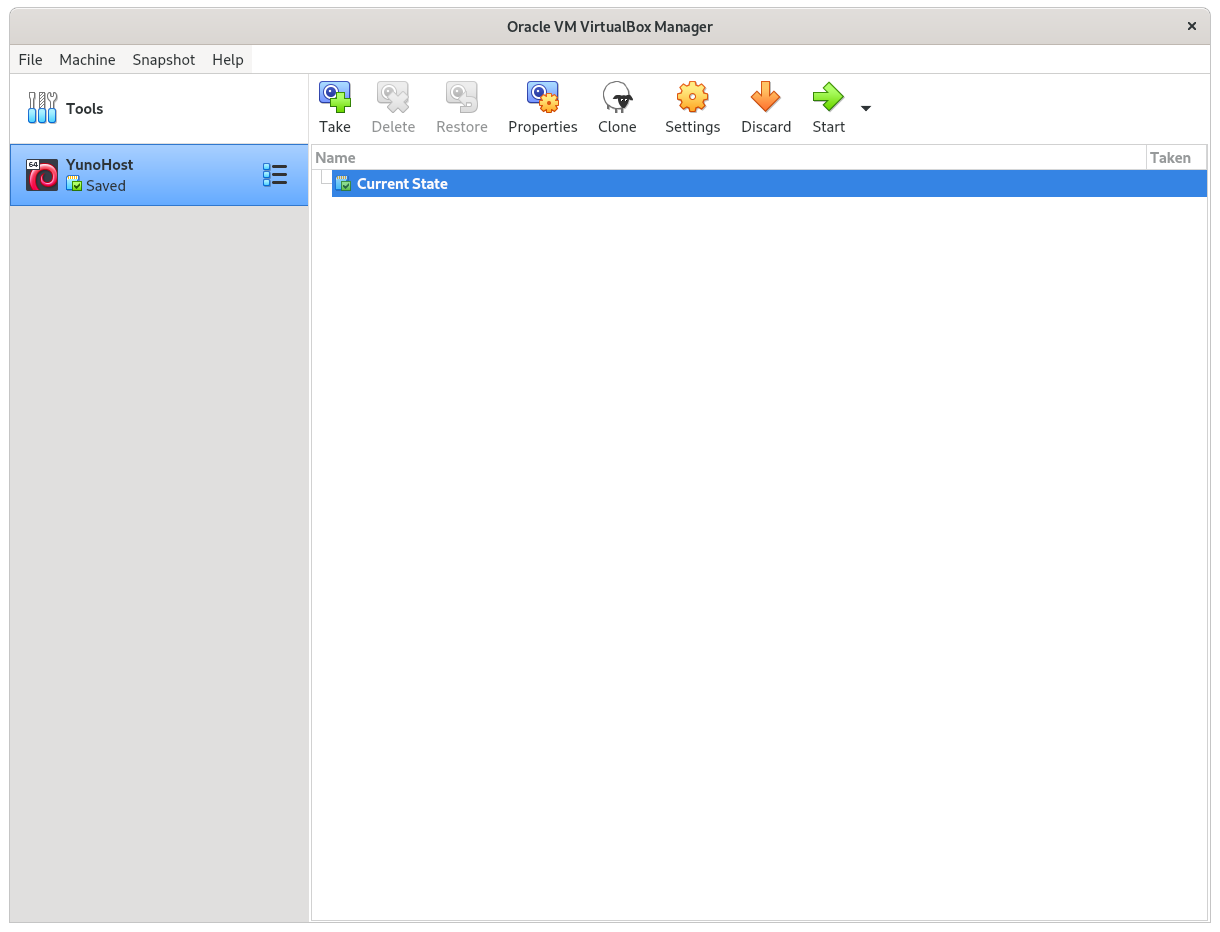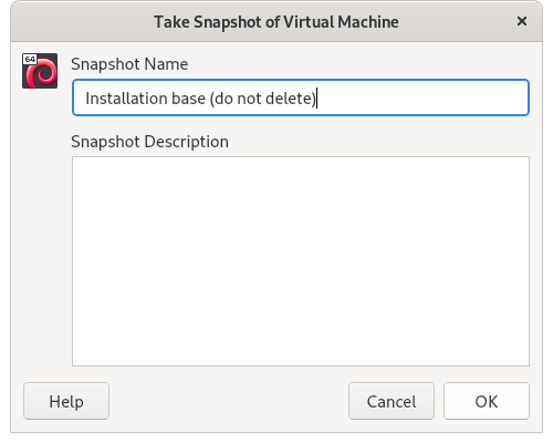 Before starting to play with the virtual machine, now is a good time to take a first snapshot, so that we don't have to redo the full install process every time. First, stop the virtual machine.