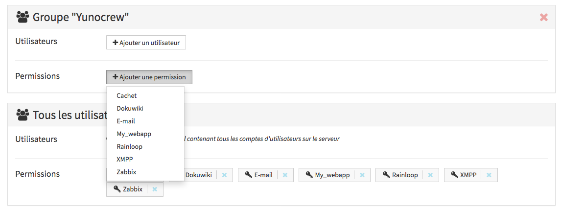 The permission mechanism allow to restrict access to services (for example mail, XMPP...) and apps, or even specific parts of the apps (for example the administration interface of WordPress).