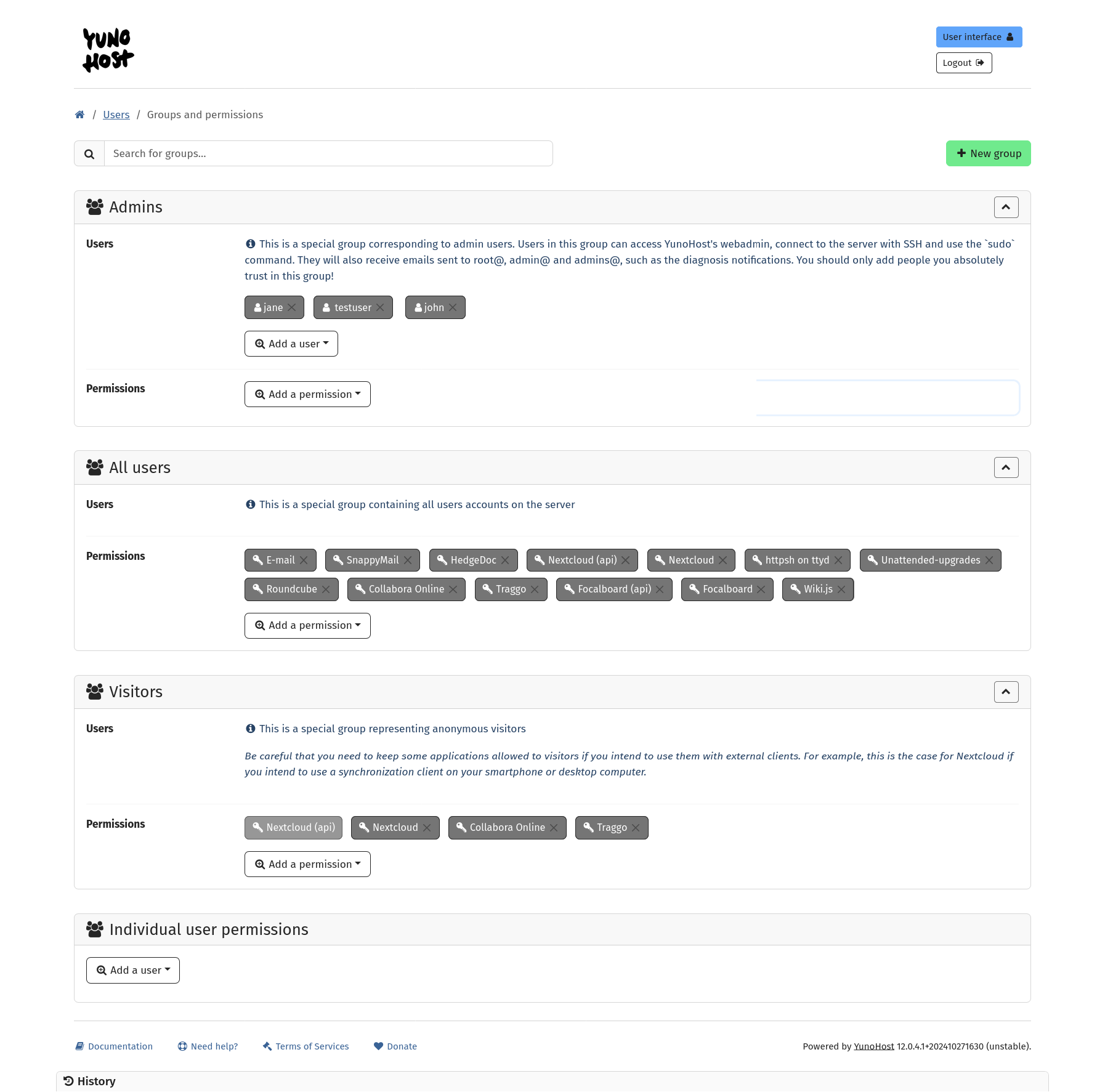 • admins, that contains YunoHost administrators, who will have SSH access as well as to the webadmin.