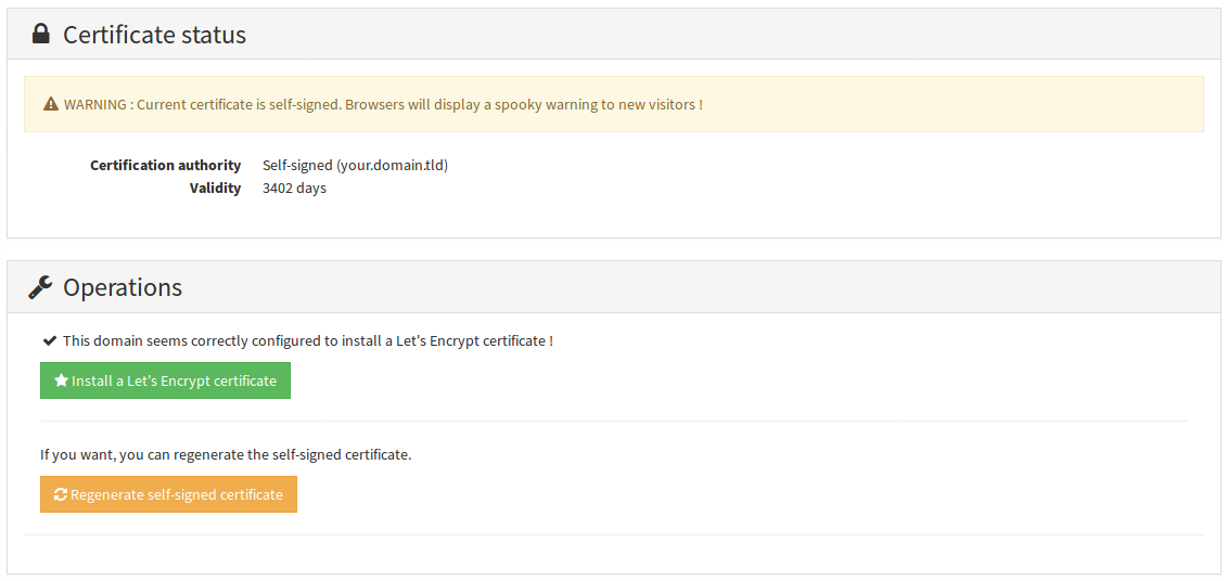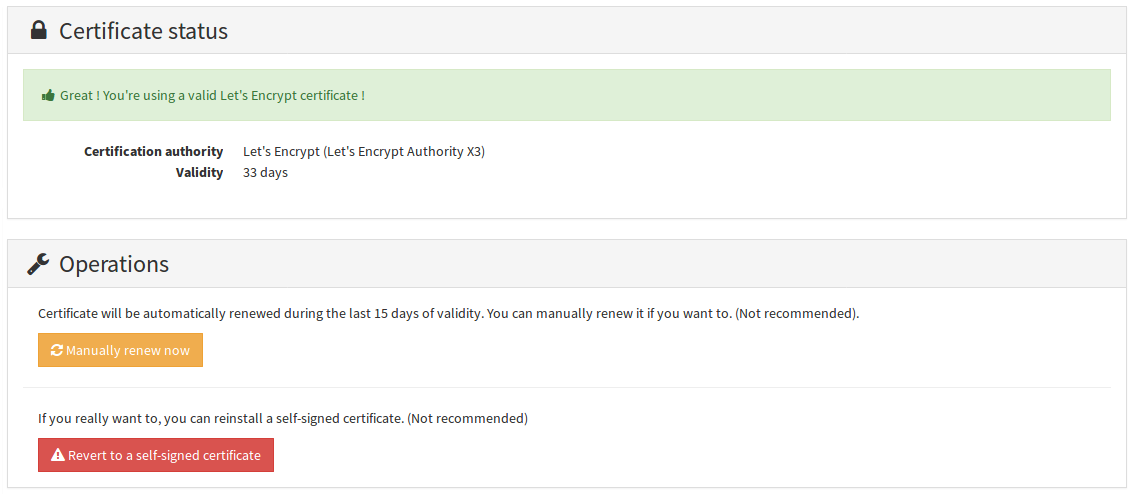 To avoid this confusion, it's possible to get a certificate signed a known authority named Let's Encrypt which provide free certificates directly recognized by browsers. YunoHost allows to directly install this certificate from the web administration interface or from the command line.