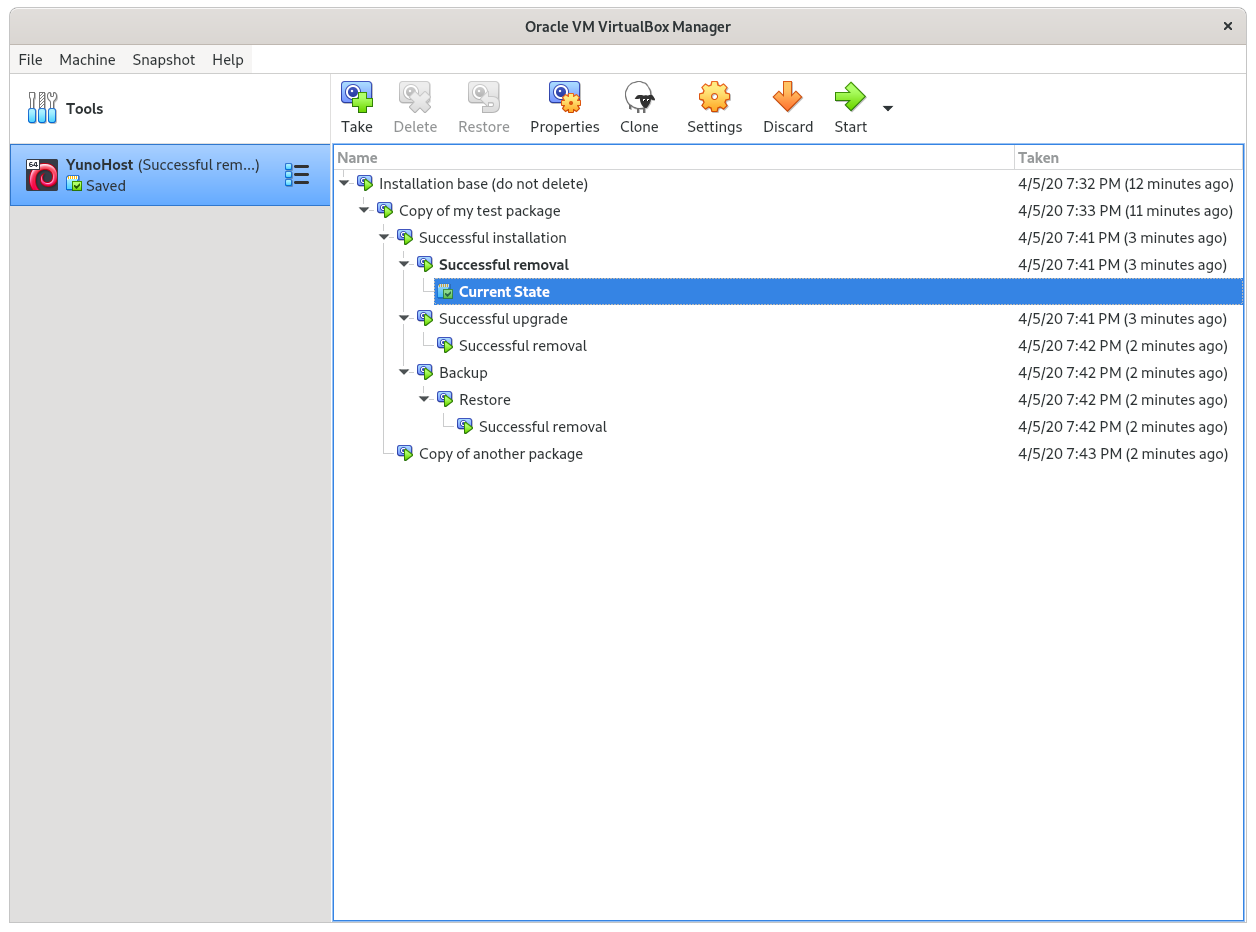 In this example, I have created two branches since my successful package installation, so as to independently test just the application removal, upgrade and backup/restore steps. I eventually got back to the virtual machine base state to start a new test on another package, without dropping my former test whatsoever. At any time, it is possible to get back to a previous snapshot simply by restoring it. The machine always start on the "Current state" state.